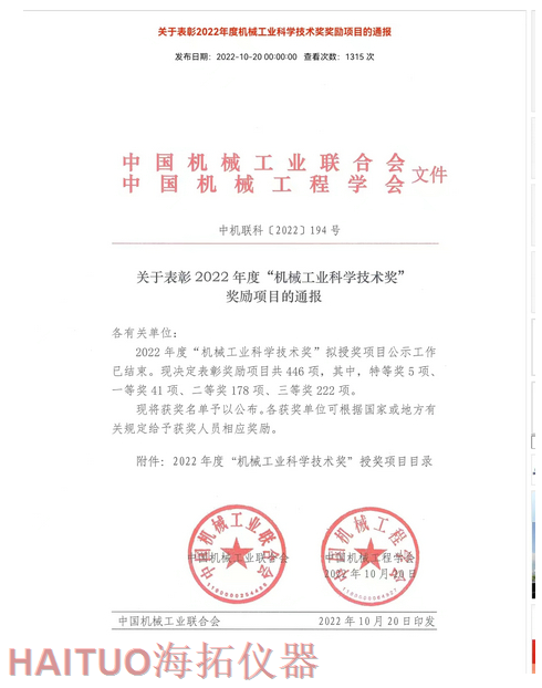 海拓儀器榮獲2022年度中國機械工業(yè)科學技術獎?ICC訊?10月20日,2022年度“中國機械工業(yè)科學技術獎”項目名錄正式發(fā)布,由海拓儀器(江蘇)有限公司完成的“超快速冷熱沖擊試驗系統(tǒng)關鍵技術研究與系列應用”項目榮獲2022年度“中國機械工業(yè)科學技術獎”三等獎。??據(jù)了解,中國機械工業(yè)科學技術獎是根據(jù)《國家科學技術獎勵條例》和《社會力量設立科學技術獎管理辦法》的有關規(guī)定,由中國機械工業(yè)聯(lián)合會和中國機械工程學會共同設立并經(jīng)國家科學技術部批準,在國家科技獎勵主管部門登記的面向全國機械行業(yè)的綜合性科技獎項。旨在表彰在機械工業(yè)科技工作中作出突出貢獻的單位和人員,獎勵范圍包括:機械工業(yè)科學技術發(fā)明成果、機械工業(yè)科學技術進步成果、機械工業(yè)工程化和新技術推廣成果和機械工業(yè)軟科學和標準成果。??海拓儀器是一家集研發(fā)、制造、貿易于一體高科技現(xiàn)代化公司,公司成立于2005年,主要產(chǎn)品包括:超快速冷熱沖擊試驗機(熱流儀)、快速溫變應力篩選試驗箱(ESS), -